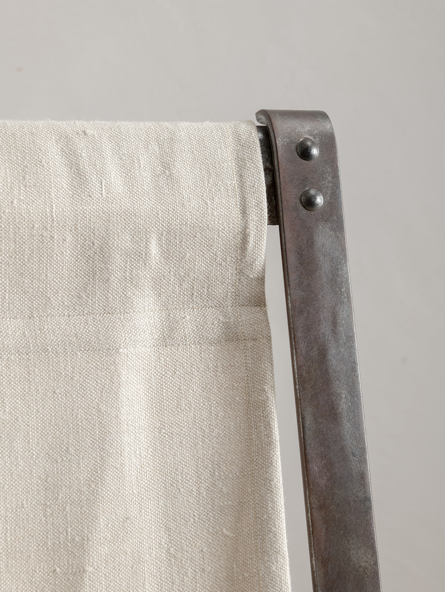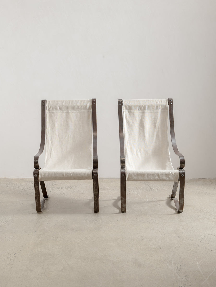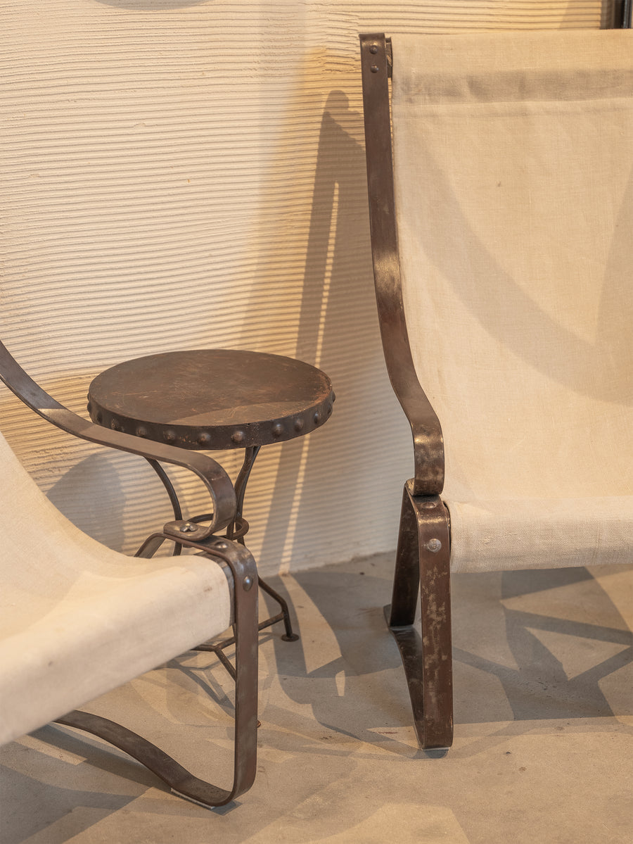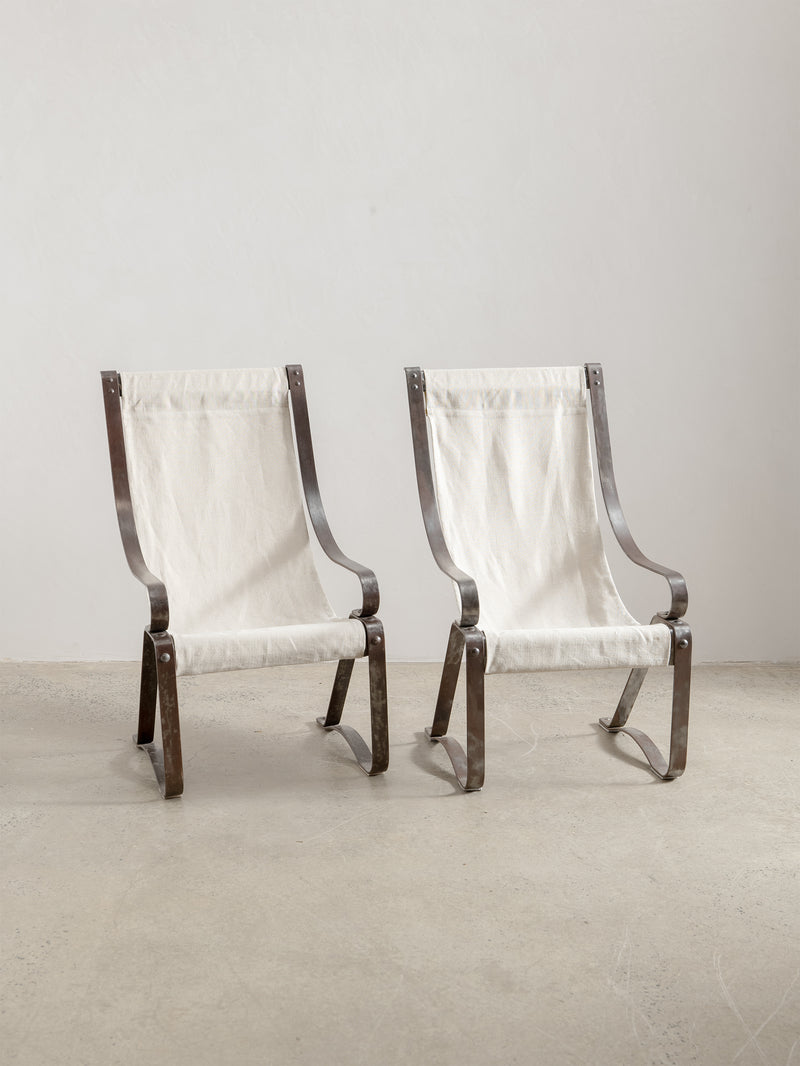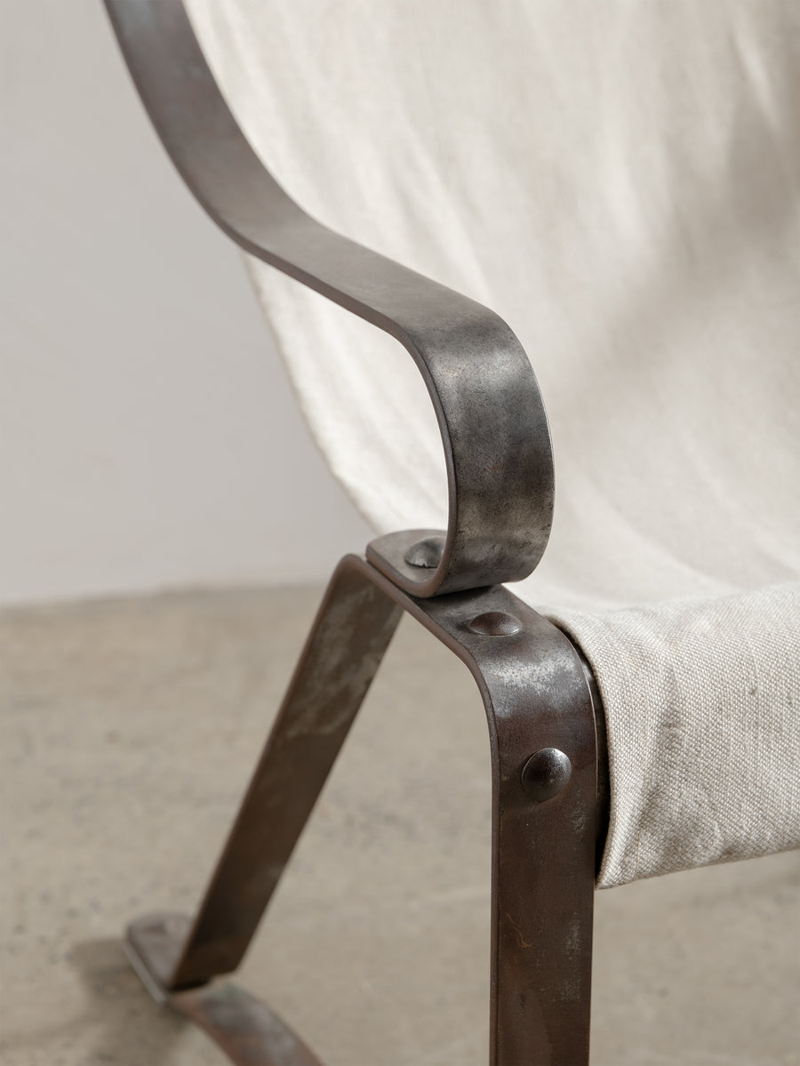 A rare 1930s sling back chair by Italian designer Salvatore Bevelaqua, showcasing the refined minimalism of early modernist design. Its sculptural metal frame supports a simple linen sling, creating a piece that is both utilitarian and elegant. The gentle curve of the frame adds rhythm and ease, while the raw patina of the metal contrasts beautifully with the natural textile. A timeless expression of form and function, this chair reflects Bevelaqua’s considered approach to proportion and material. Each chair carries unique variations in surface and finish, celebrating its handmade and historic character.