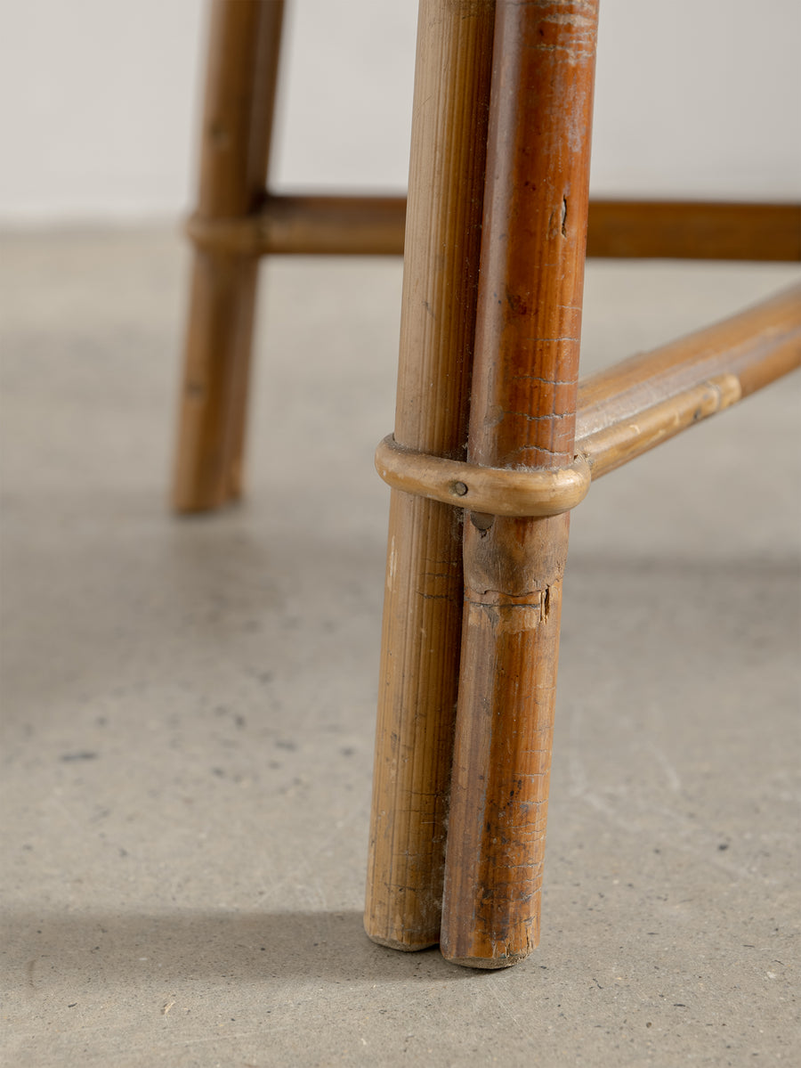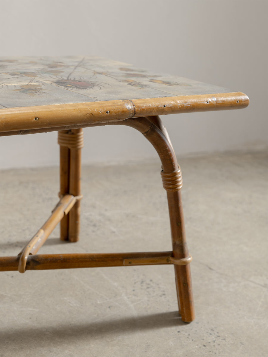 Signed piece by Audoux-Minet and Georges Chassin. This rattan coffee table is defined by its light bamboo frame and ceramic tiled top, a composition that reflects the designers’ affinity for natural materials and artisanal craft. The handwoven cane structure lends warmth and texture, while the decorative tile surface introduces a refined graphic quality. Both practical and sculptural, this work embodies the enduring spirit of French mid-century design.