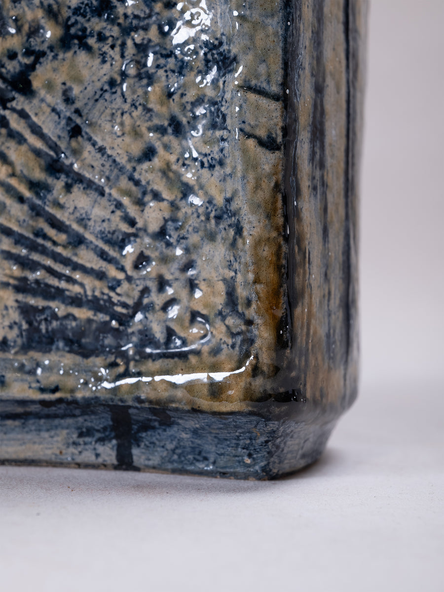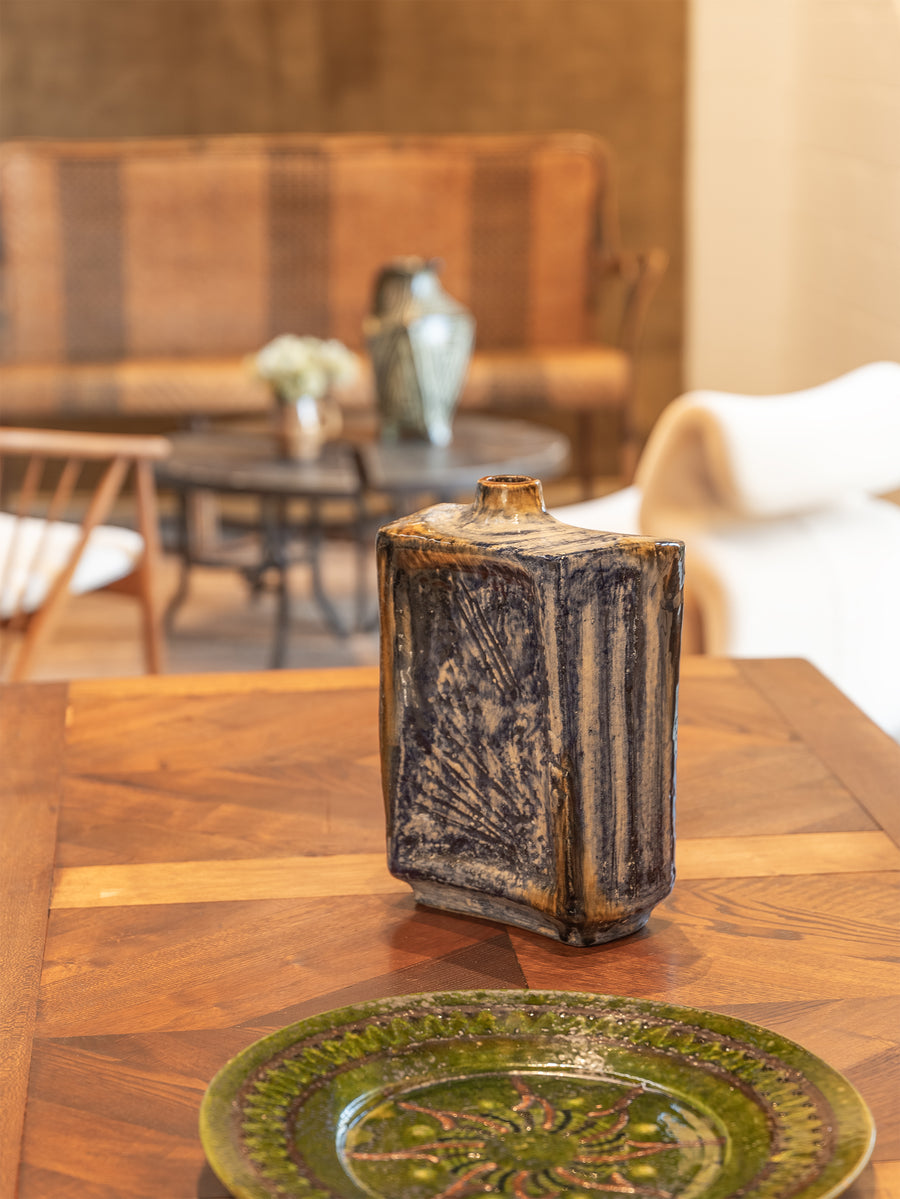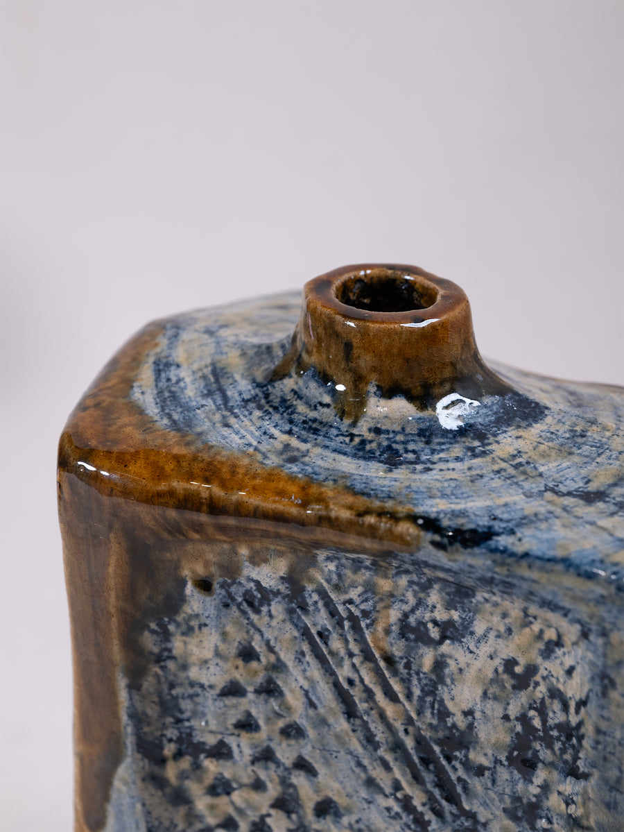 Defined by bold angular forms and richly textured surfaces, these glazed ceramic vessels reveal a dynamic interplay of earthy tones, deep blues, and expressive carved motifs. Their sculptural presence balances function with artistry, embodying the modernist spirit of mid-century ceramic design.