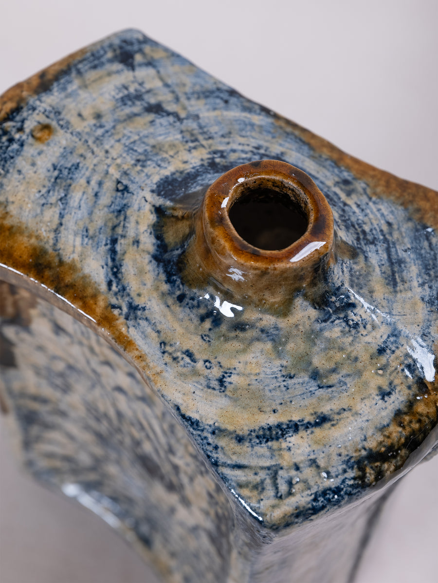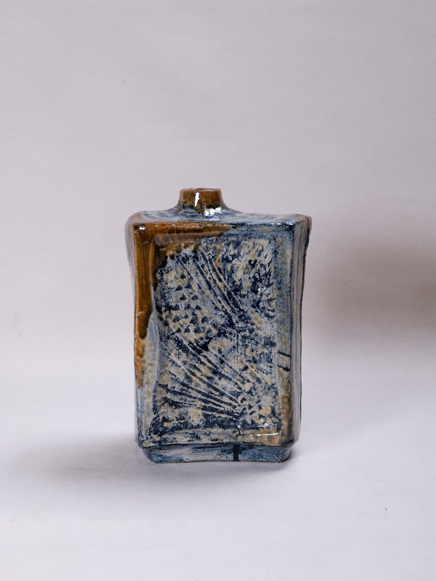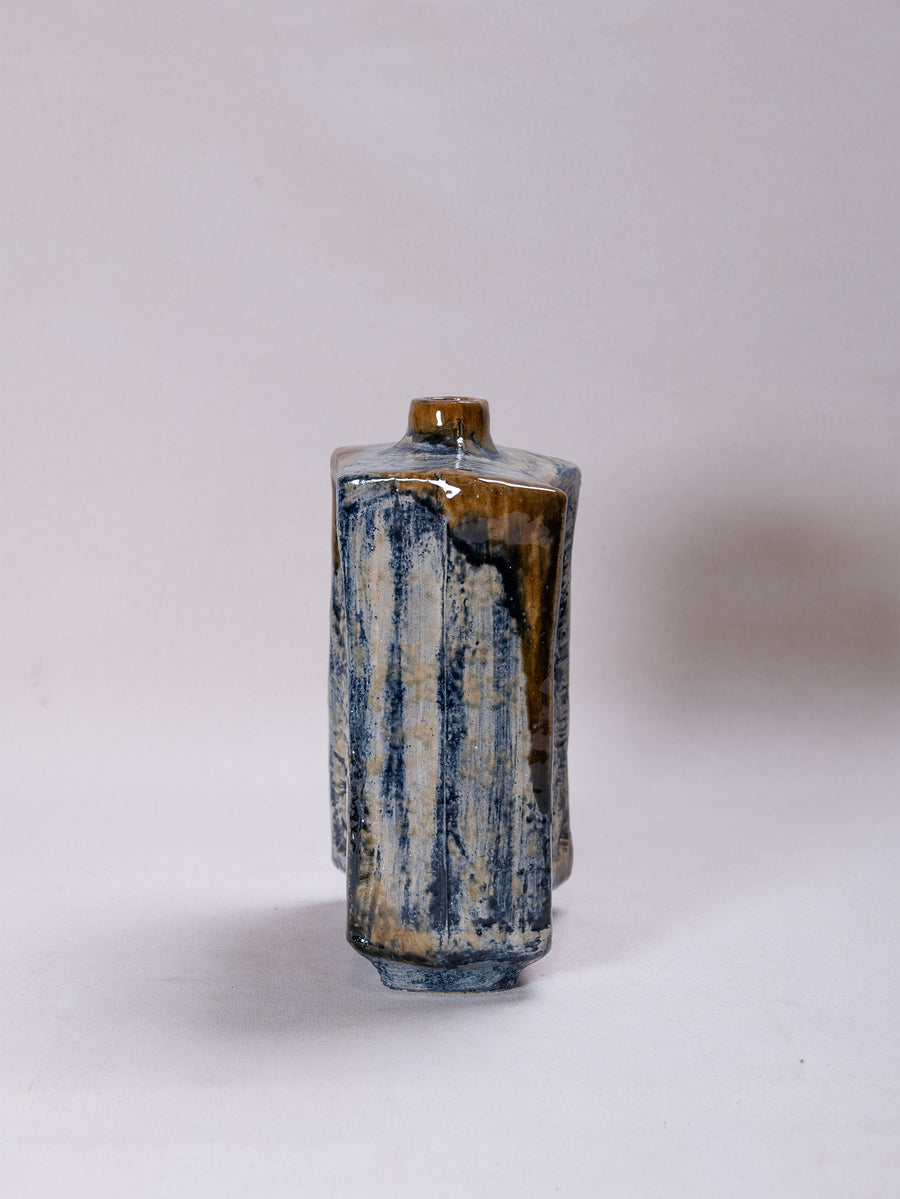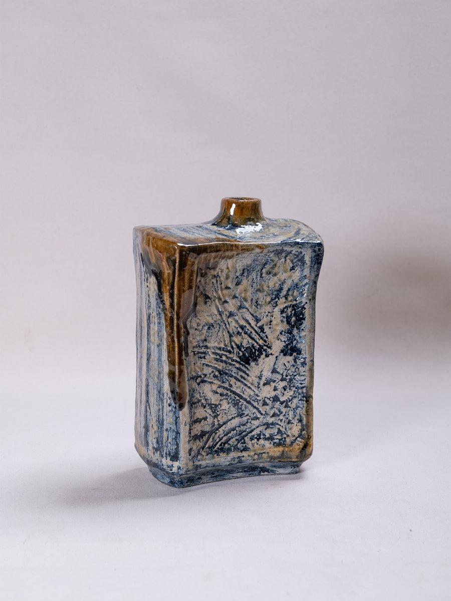 Defined by bold angular forms and richly textured surfaces, these glazed ceramic vessels reveal a dynamic interplay of earthy tones, deep blues, and expressive carved motifs. Their sculptural presence balances function with artistry, embodying the modernist spirit of mid-century ceramic design.