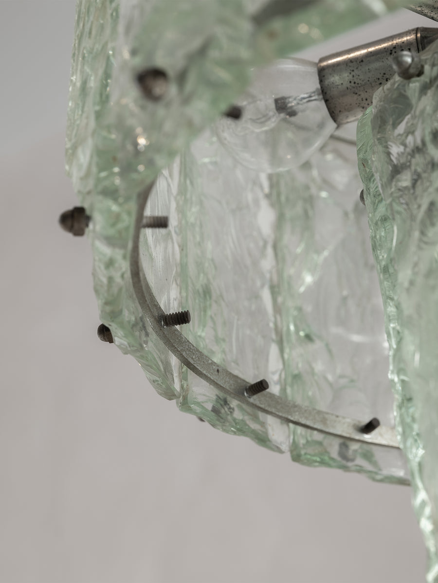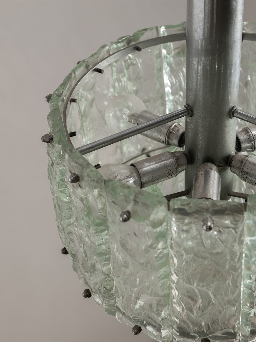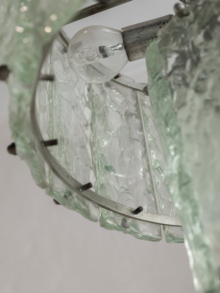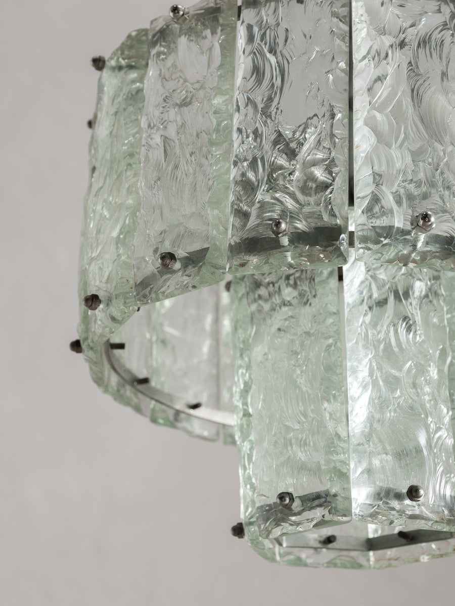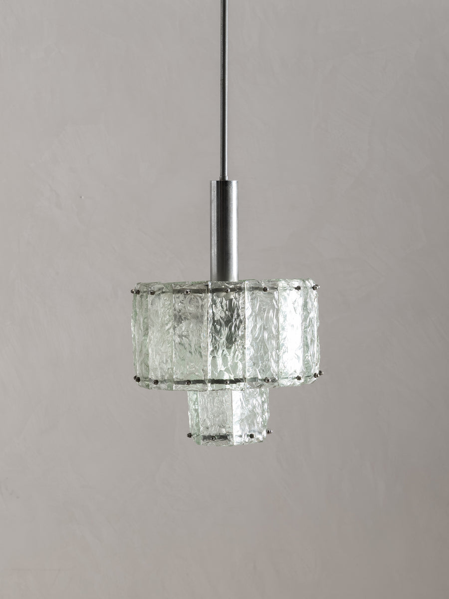 An elegant expression of Italian lighting design, this chandelier pendant features a nickel-brass frame with a tiered arrangement of hand-hammered glass panels. The shade is composed of two concentric sequences—an inner tier of smaller glass pieces, and a larger outer tier that diffuses light with textured clarity.