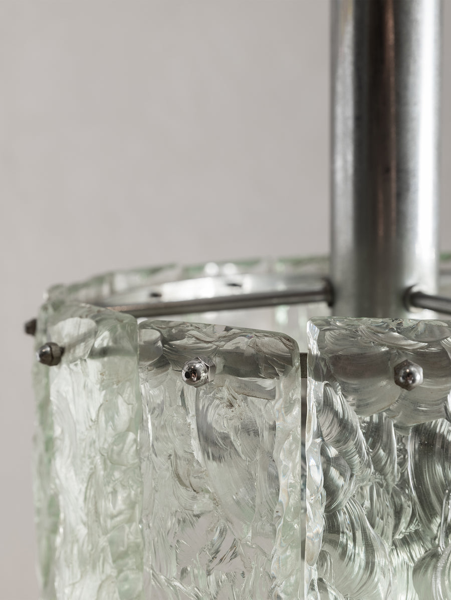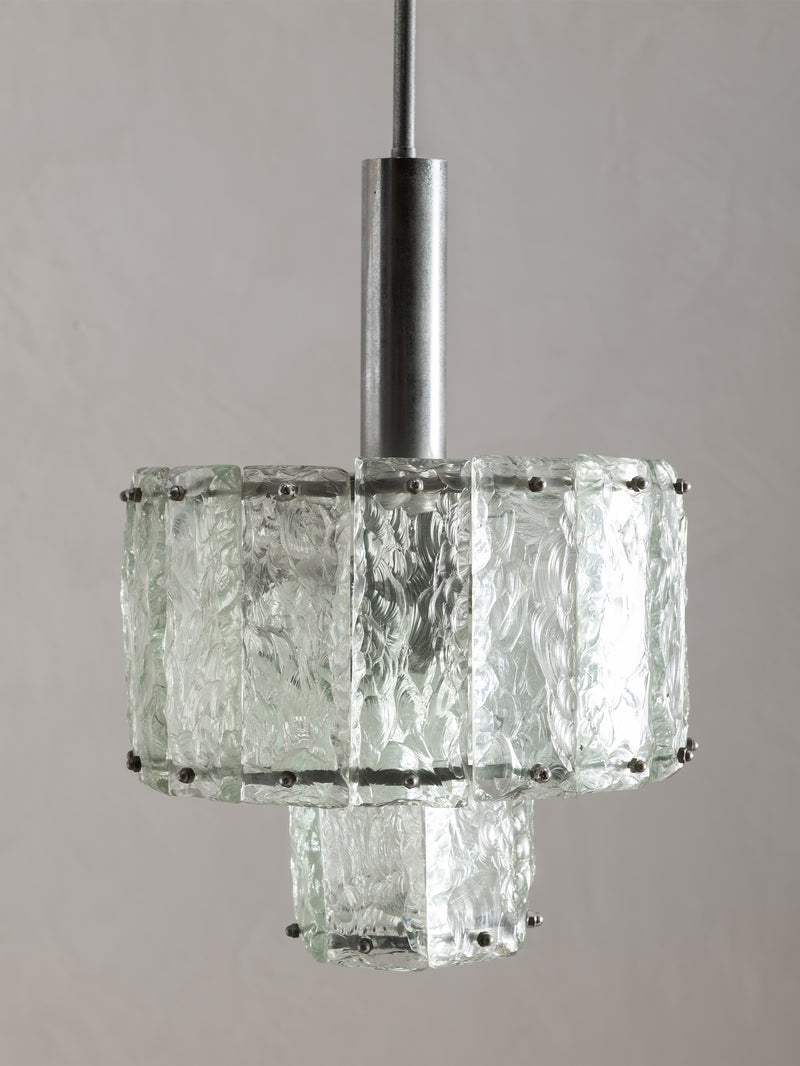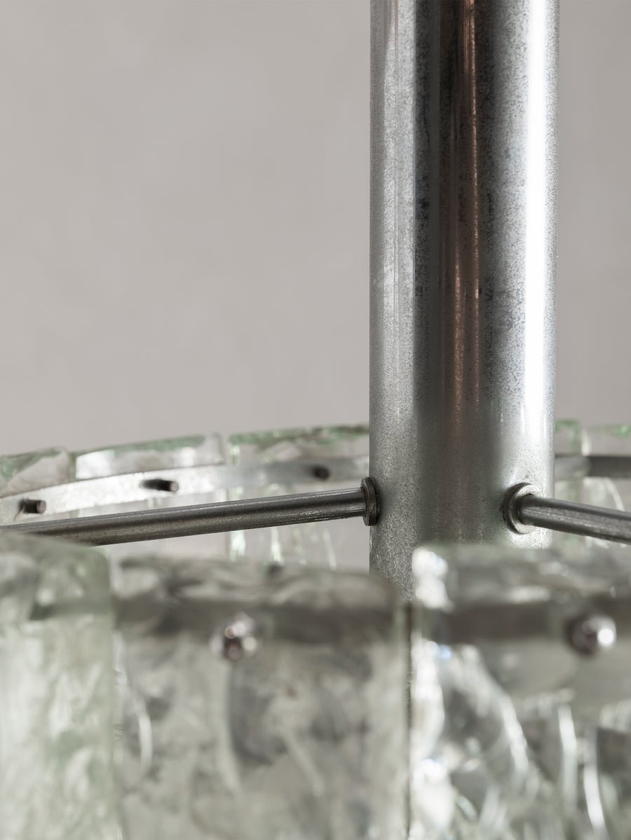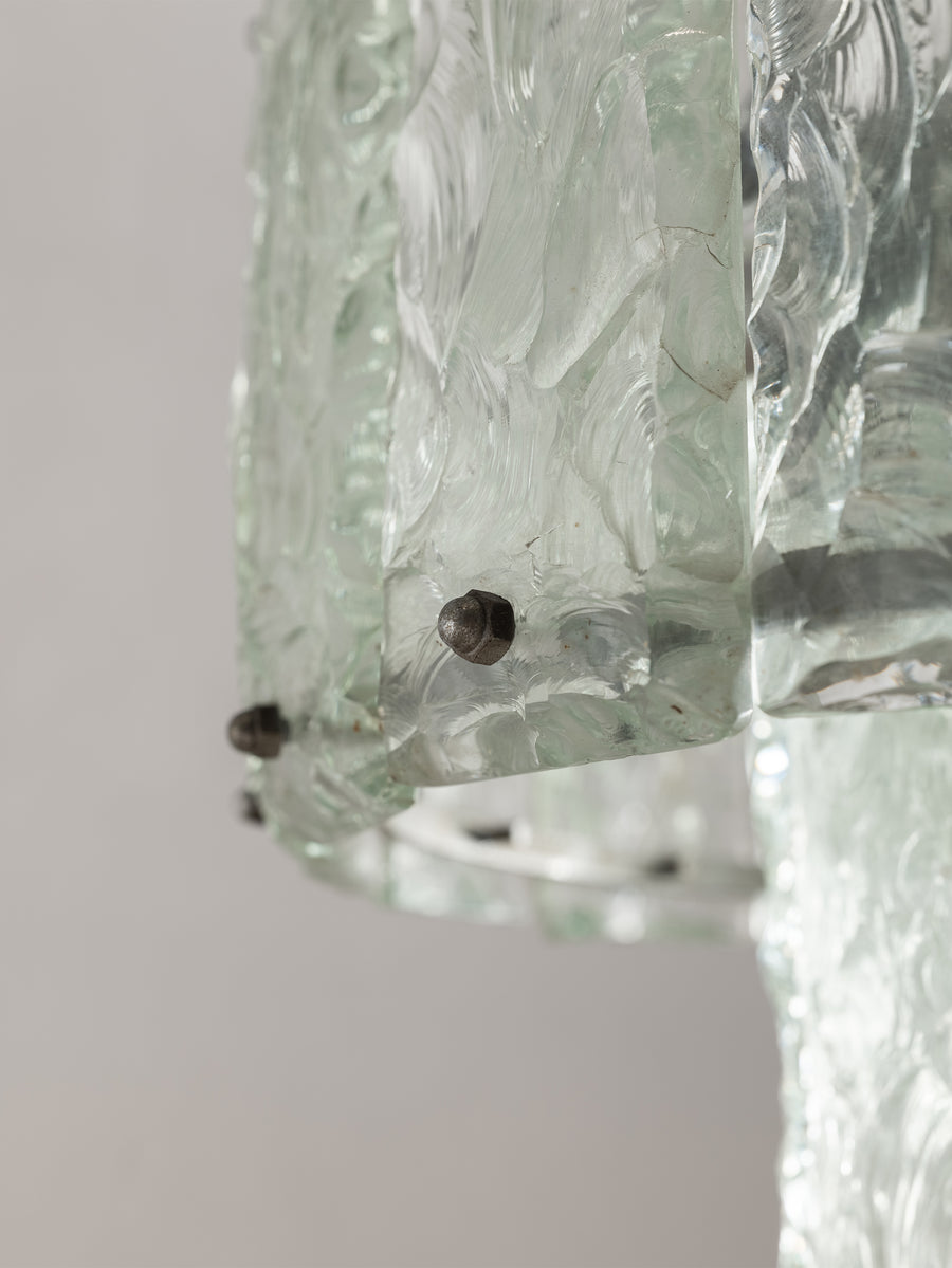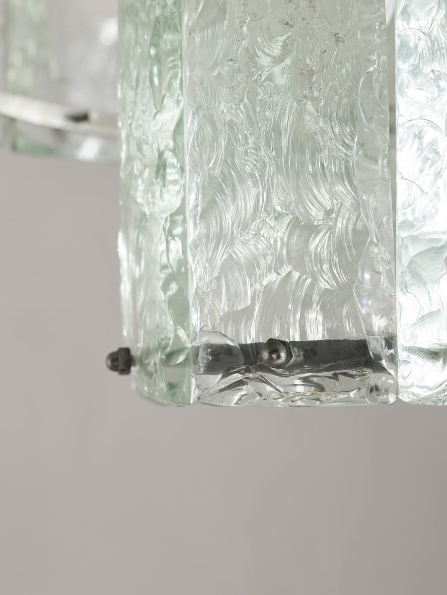 An elegant expression of Italian lighting design, this chandelier pendant features a nickel-brass frame with a tiered arrangement of hand-hammered glass panels. The shade is composed of two concentric sequences—an inner tier of smaller glass pieces, and a larger outer tier that diffuses light with textured clarity.