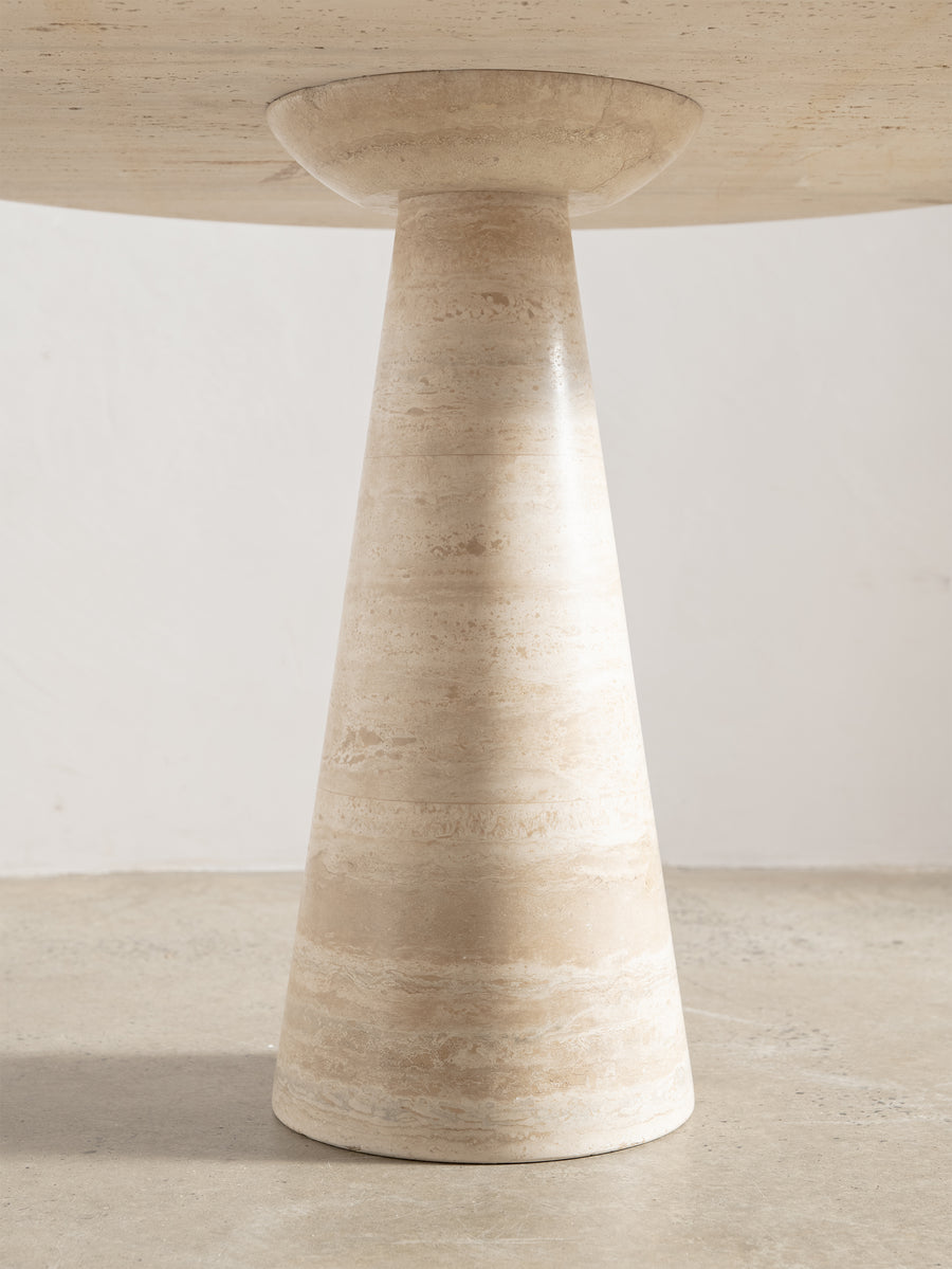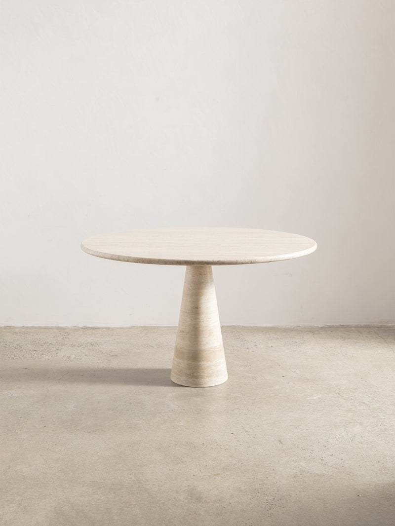 Designed by Angelo Mangiarotti, the M1 T70 table is a refined example of his approach to form, material and balance. Crafted in solid travertine, the circular top rests on a tapered pedestal base, creating a clean, architectural silhouette with a strong sense of proportion.