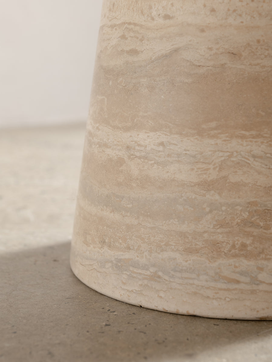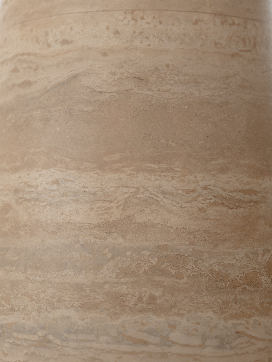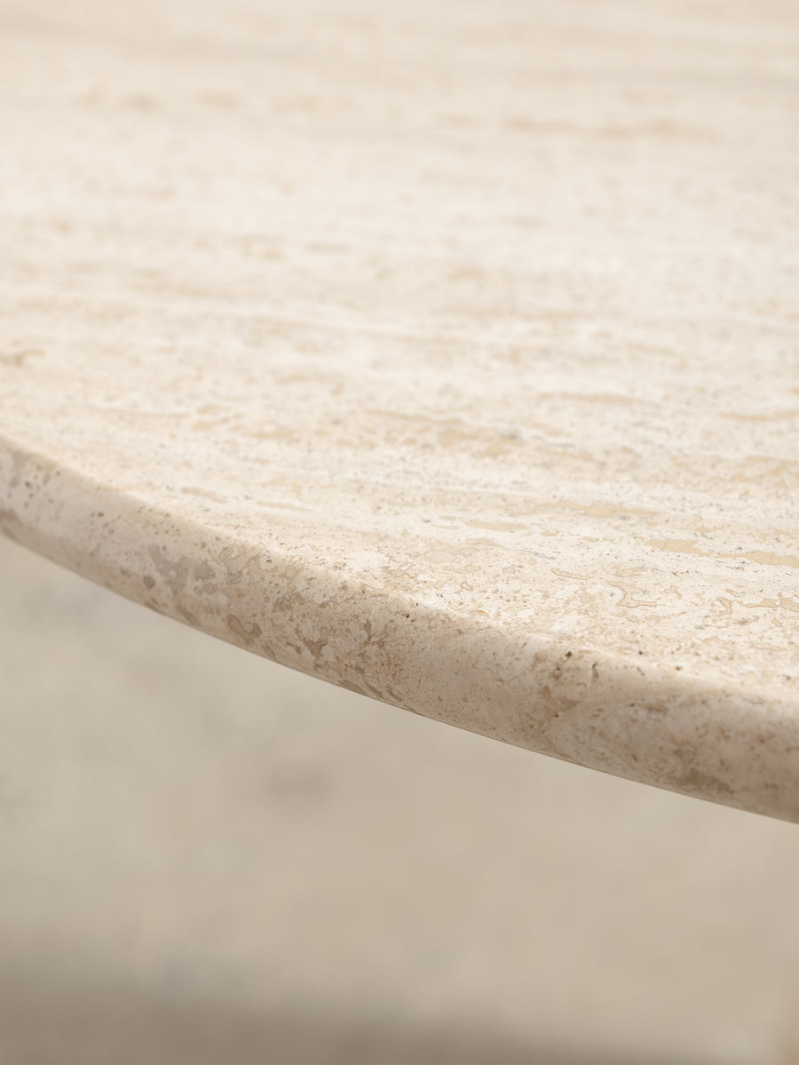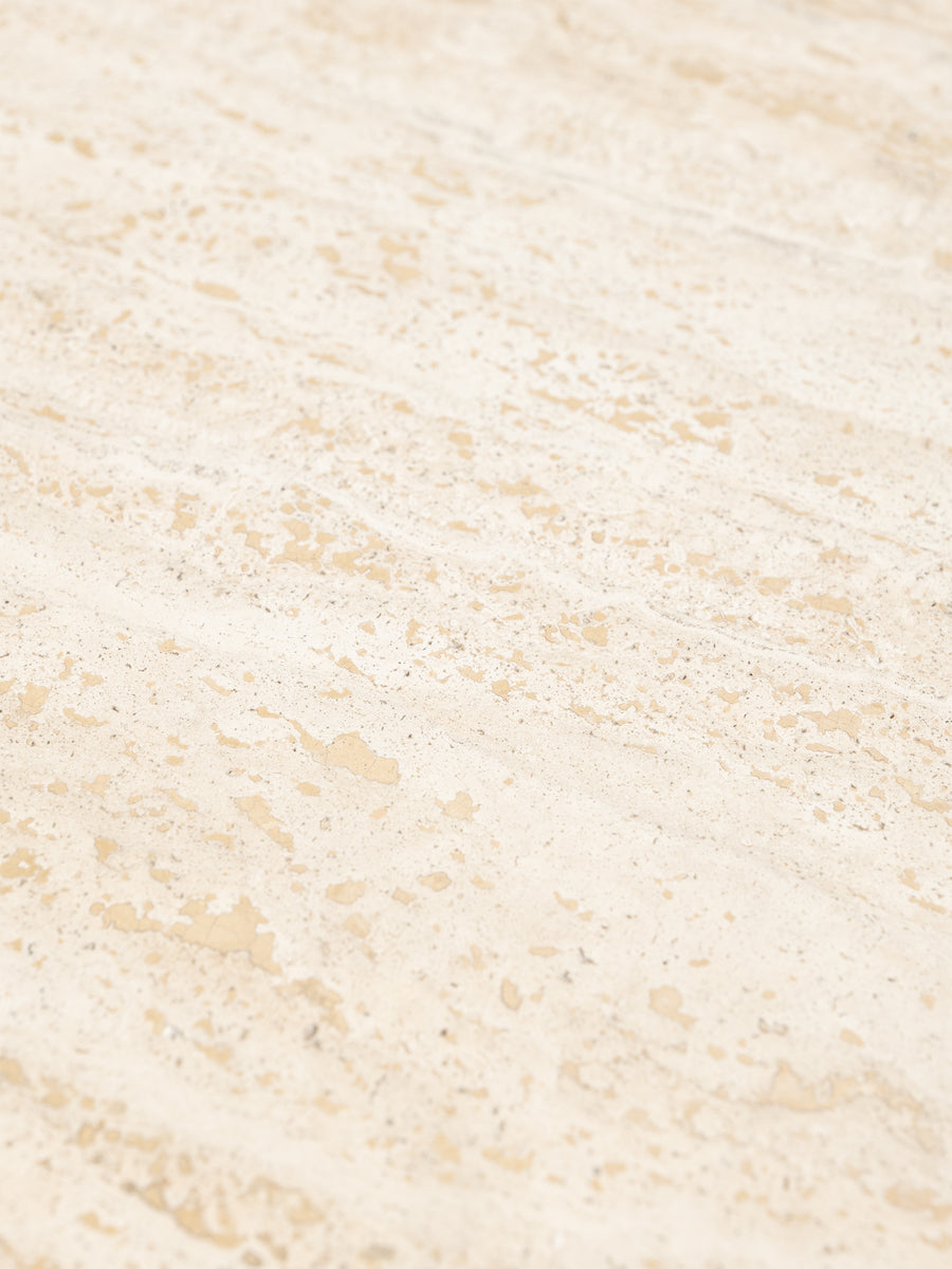 The design is defined by its simplicity, where the weight of the stone is resolved through precise construction and considered geometry. Subtle tonal variation and natural markings within the travertine bring depth and texture, softening the overall form.