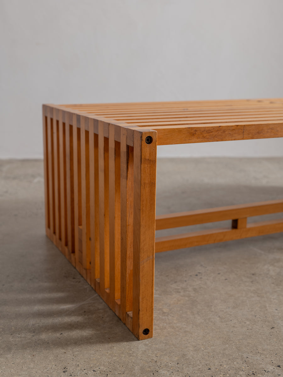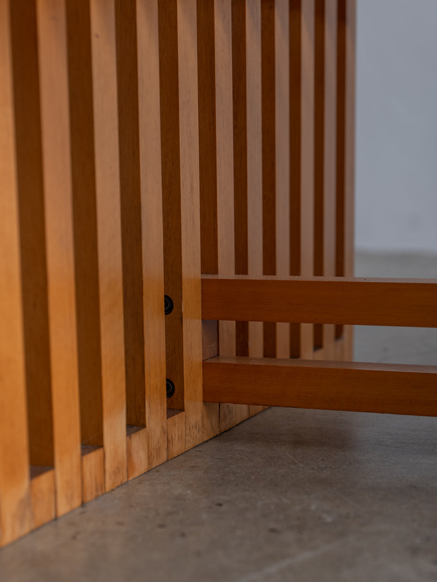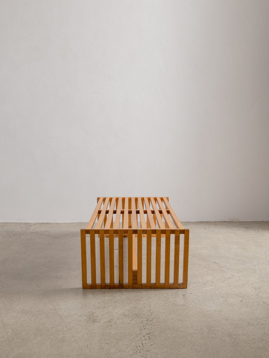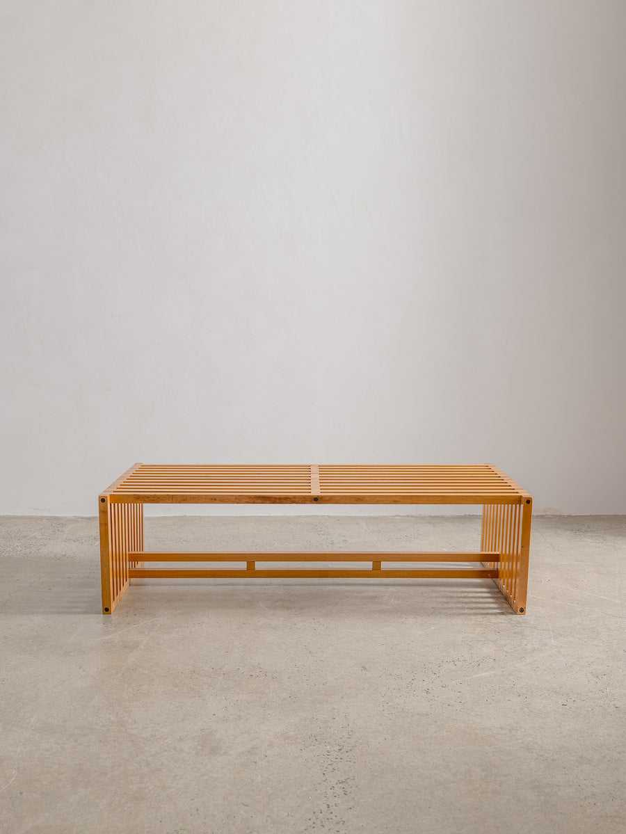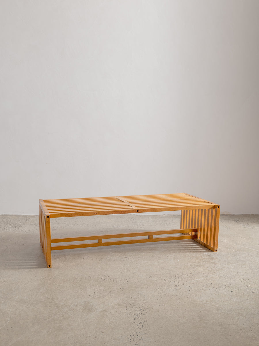 Timeless and understated, the ARA low table by Lella and Massimo Vignelli for Driade is a true celebration of minimalist Italian design. Created in 1974, its wooden slat structure is both sculptural and functional, showcasing the Vignellis' signature focus on purity of form and material integrity.