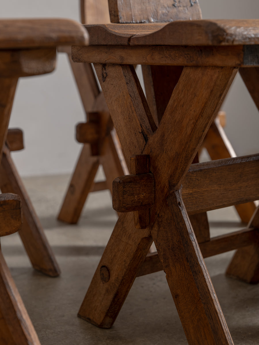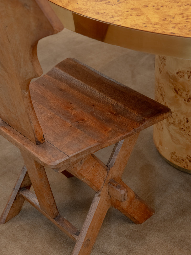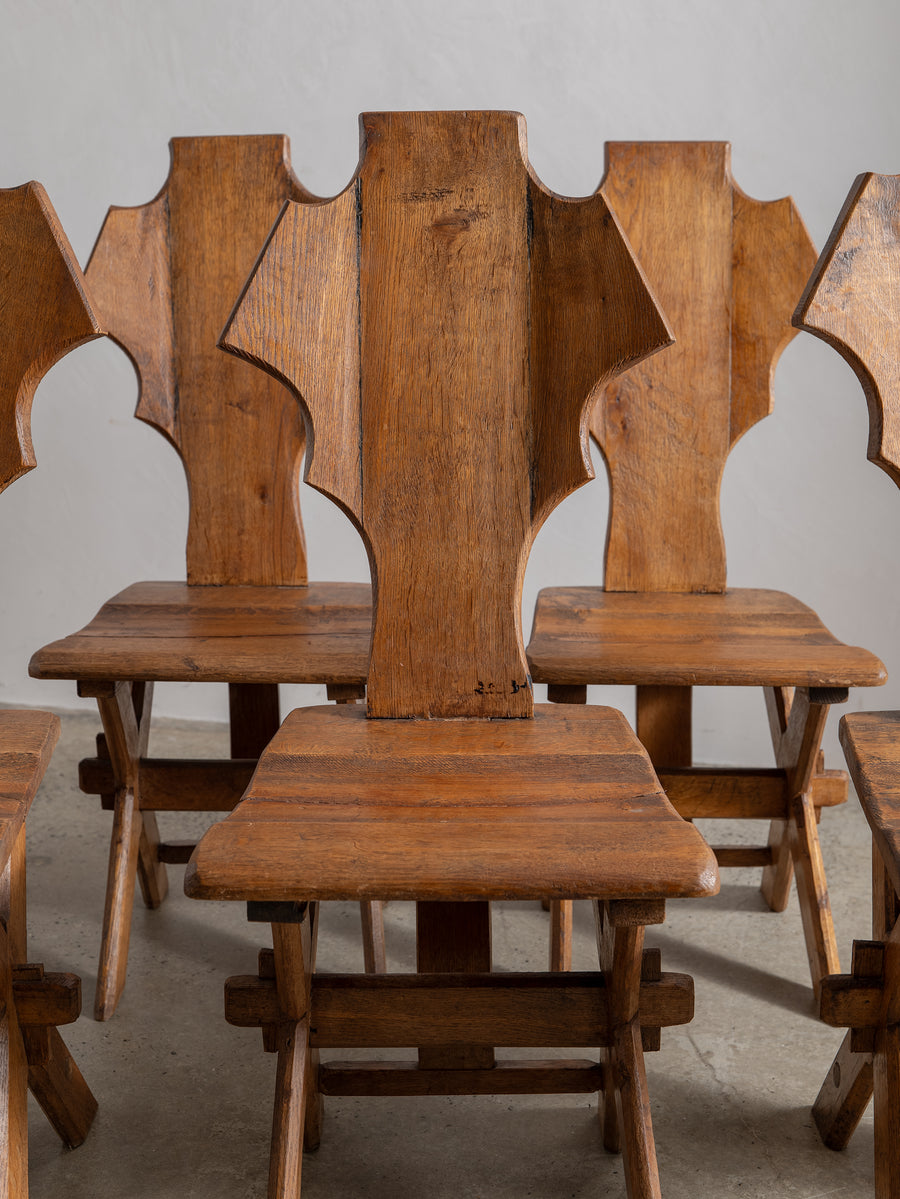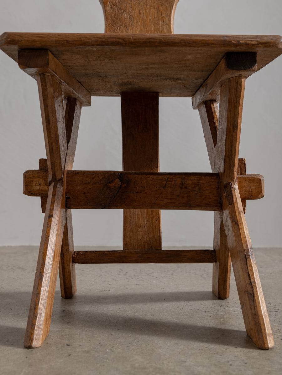 Strong, simple, and deeply functional, these Brutalist monastery chairs from Belgium embody quiet craftsmanship. Made from solid oak, their pared-back design speaks to their origins—built for purpose, with nothing unnecessary. Time has softened their edges, adding warmth to their raw, architectural form. A striking addition to any space, they bring presence without excess.