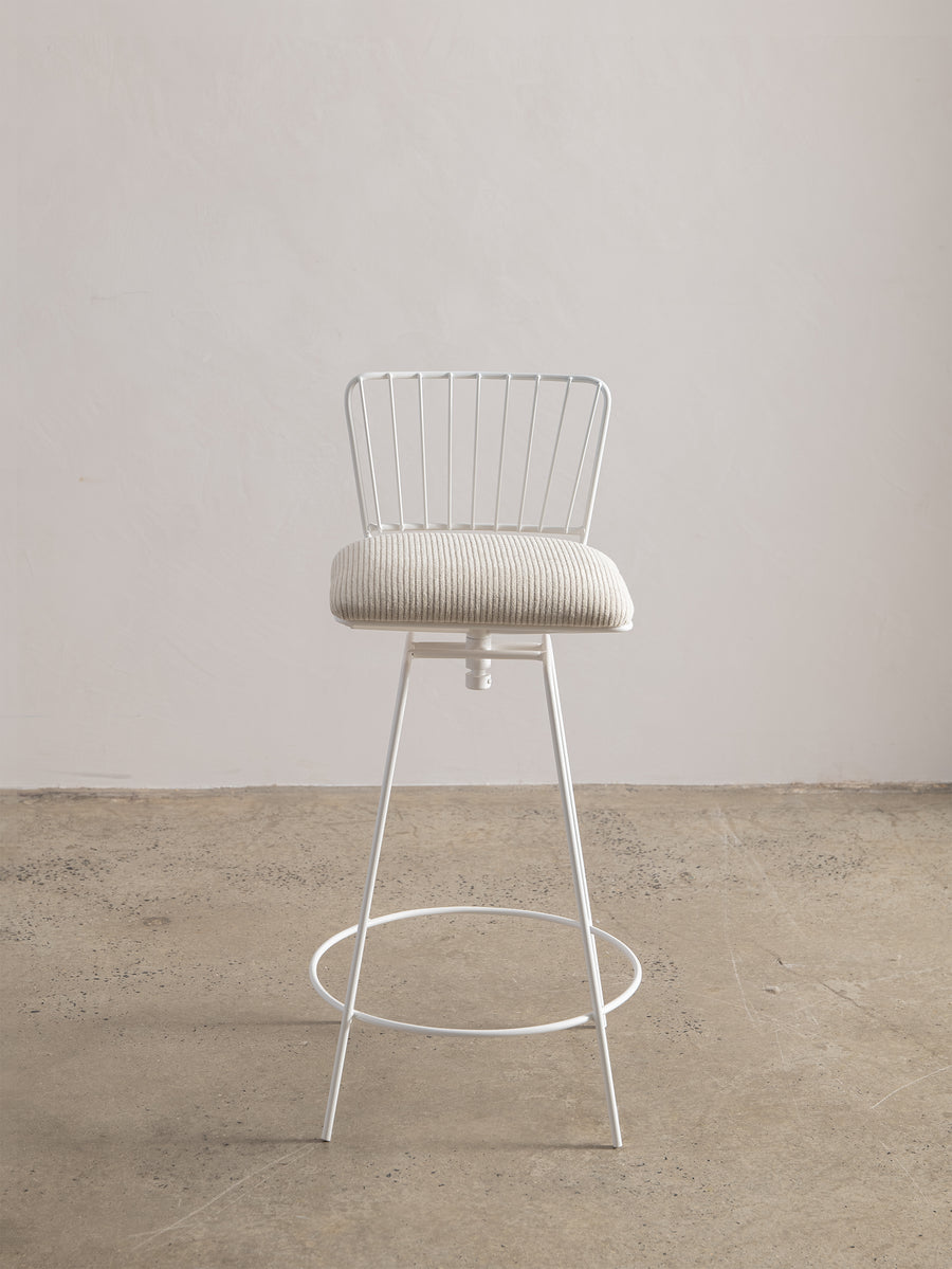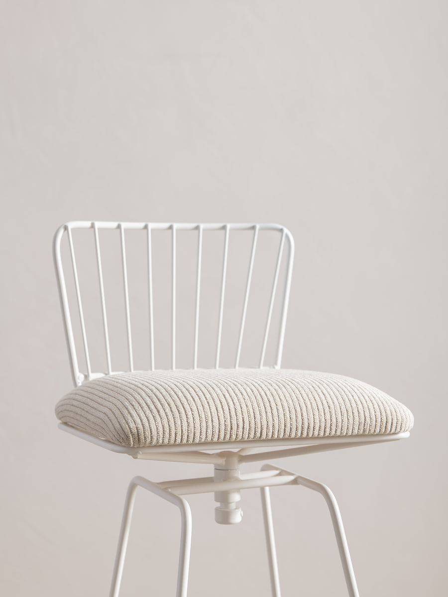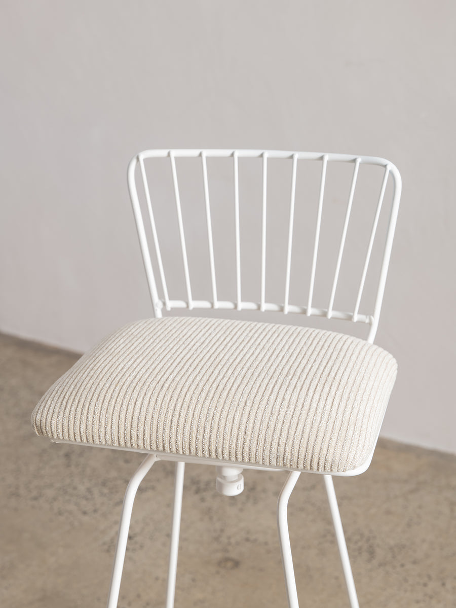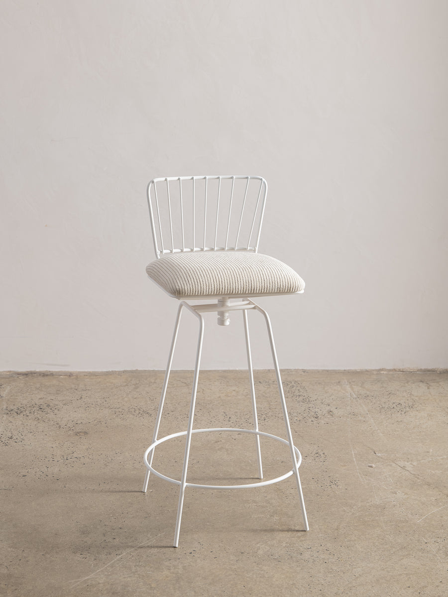 A refined take on a mid-century classic. With its sculptural silhouette and effortless swivel, this bar stool is designed for both comfort and conversation. The newly upholstered seat in Perennials fabric features a touchy-feely stripe that looks like a comfy, cozy corduroy, offering both texture and durability. The white powder-coated frame lends a fresh, modern edge. Understated, functional, and timeless—an inviting addition to any space.