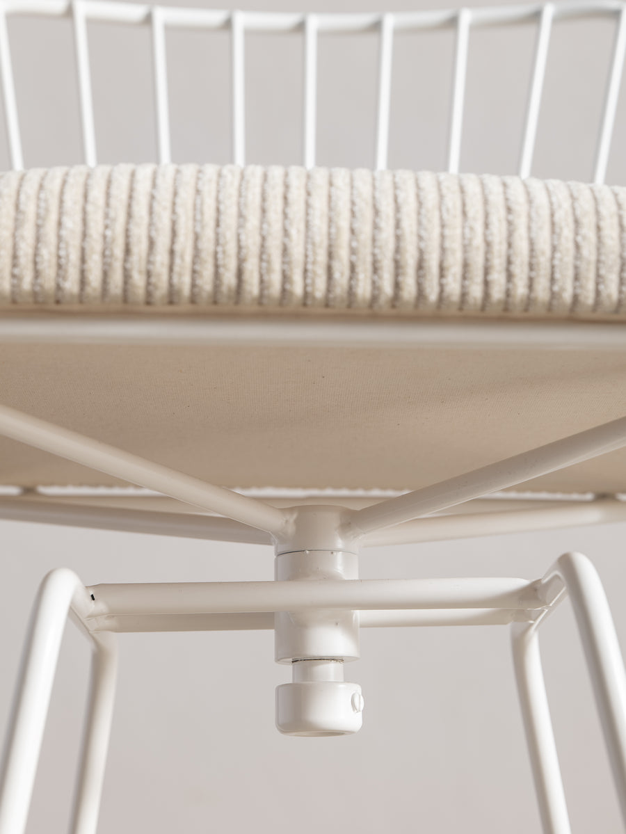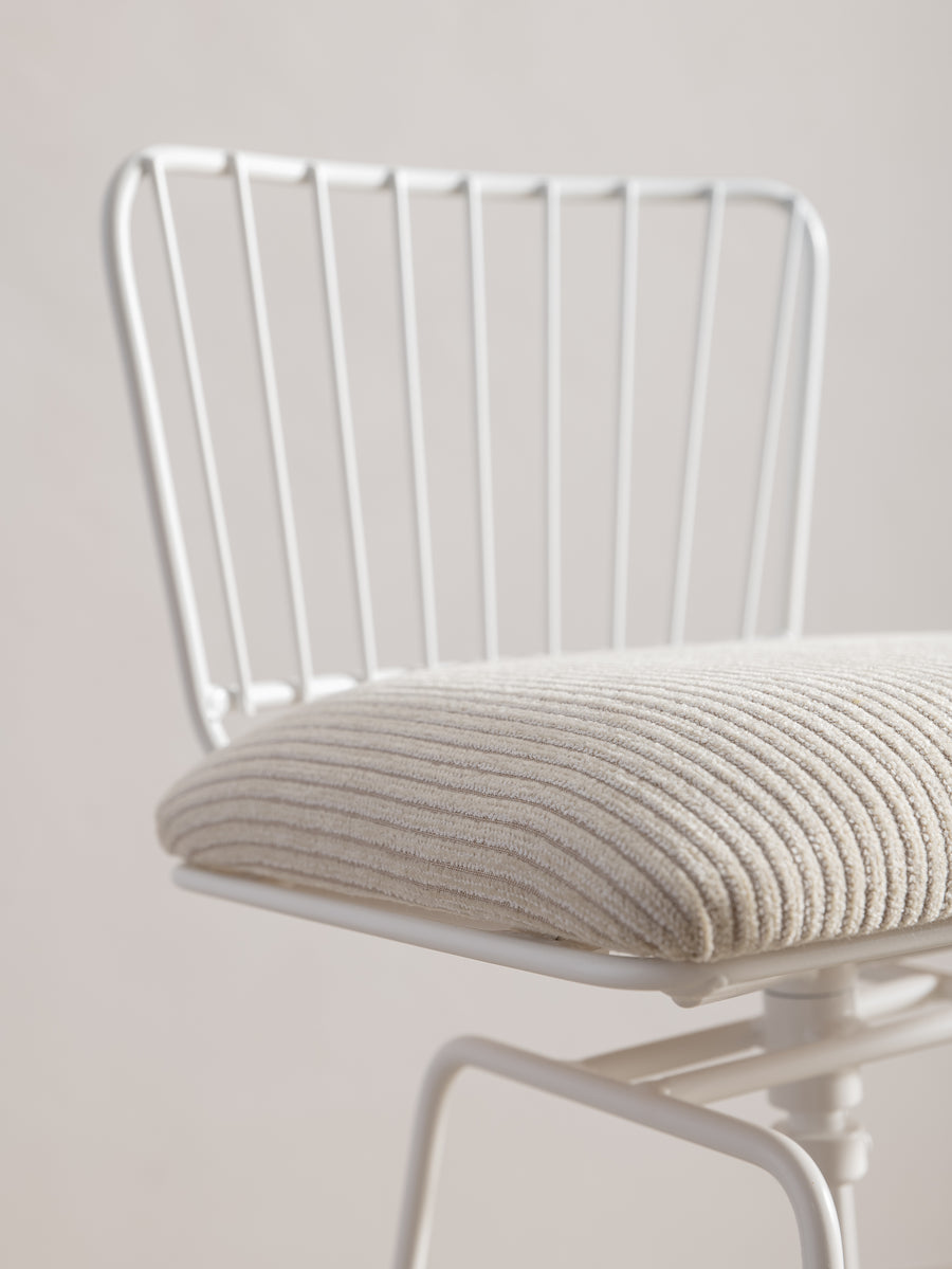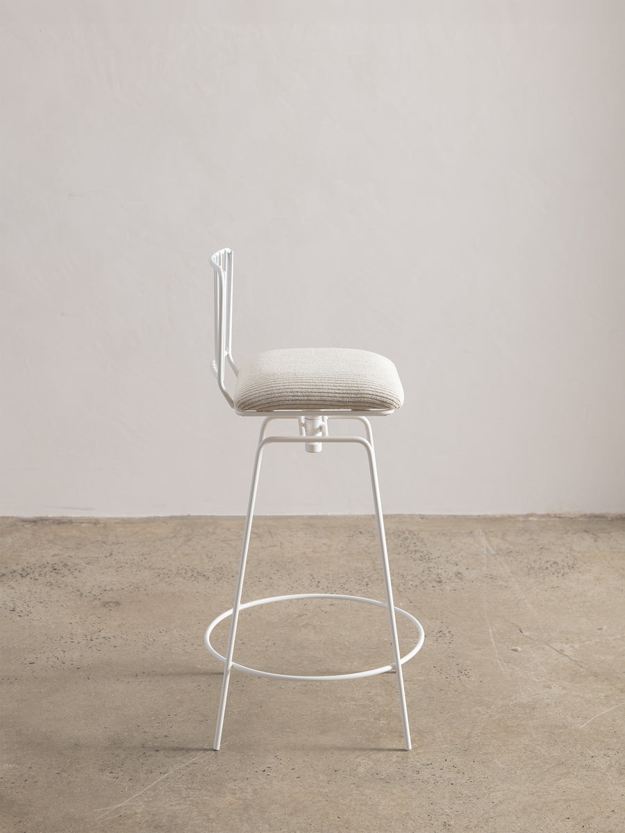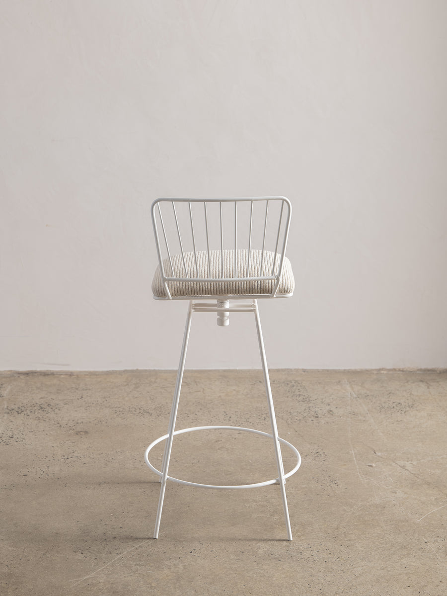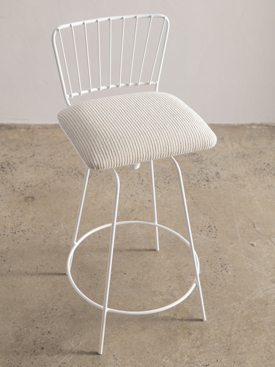 A refined take on a mid-century classic. With its sculptural silhouette and effortless swivel, this bar stool is designed for both comfort and conversation. The newly upholstered seat in Perennials fabric features a touchy-feely stripe that looks like a comfy, cozy corduroy, offering both texture and durability. The white powder-coated frame lends a fresh, modern edge. Understated, functional, and timeless—an inviting addition to any space.