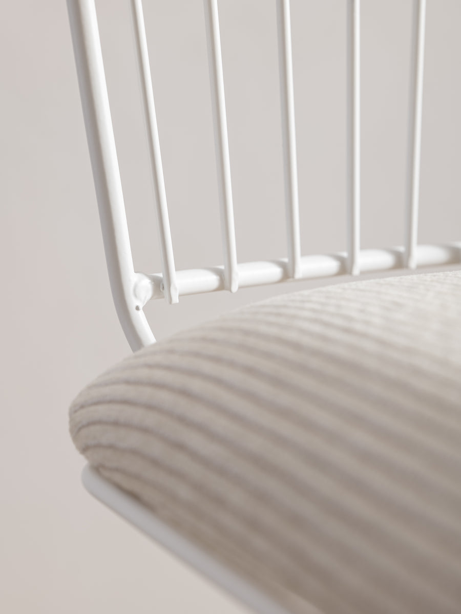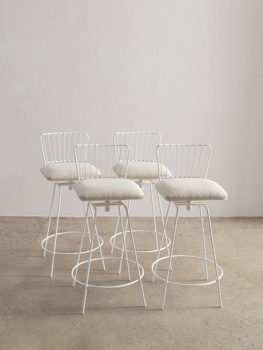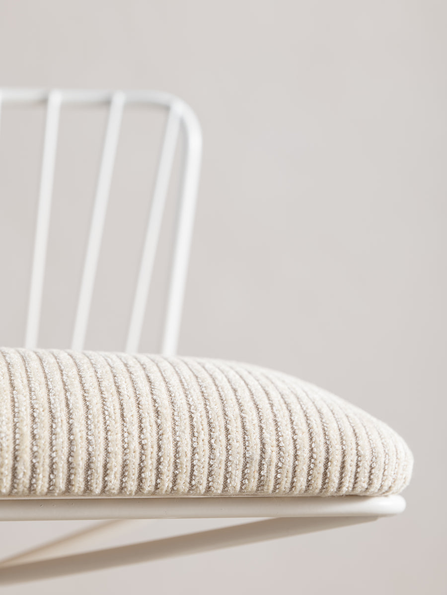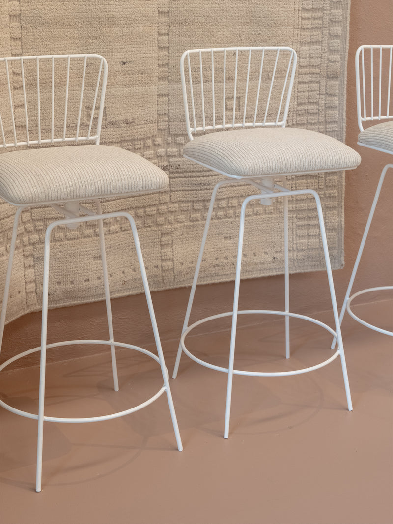 A refined take on a mid-century classic. With its sculptural silhouette and effortless swivel, this bar stool is designed for both comfort and conversation. The newly upholstered seat in Perennials fabric features a touchy-feely stripe that looks like a comfy, cozy corduroy, offering both texture and durability. The white powder-coated frame lends a fresh, modern edge. Understated, functional, and timeless—an inviting addition to any space.