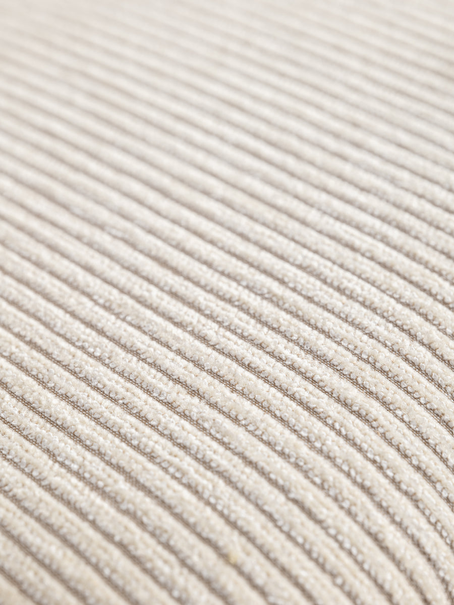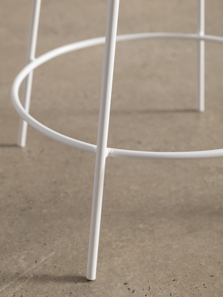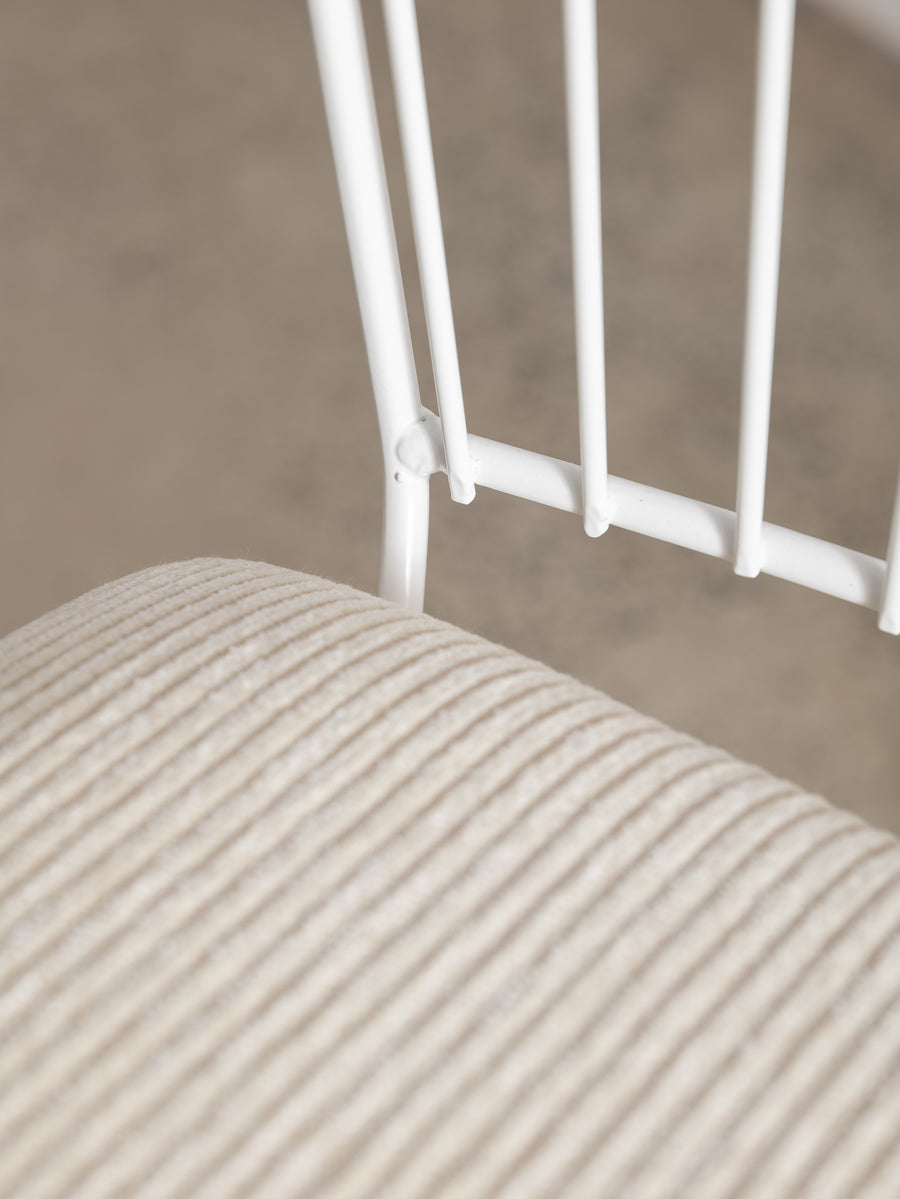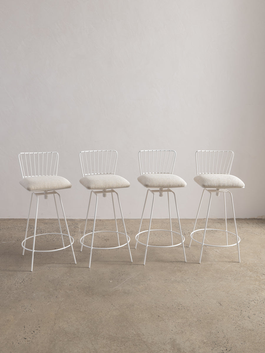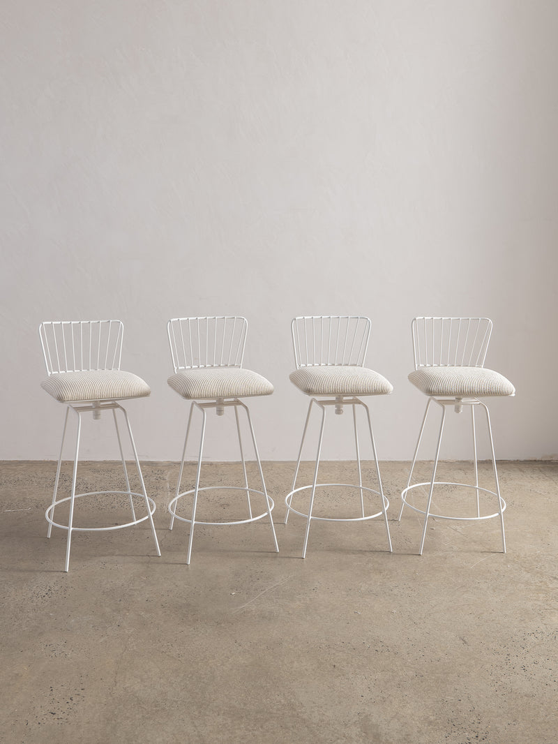 A refined take on a mid-century classic. With its sculptural silhouette and effortless swivel, this bar stool is designed for both comfort and conversation. The newly upholstered seat in Perennials fabric features a touchy-feely stripe that looks like a comfy, cozy corduroy, offering both texture and durability. The white powder-coated frame lends a fresh, modern edge. Understated, functional, and timeless—an inviting addition to any space.
