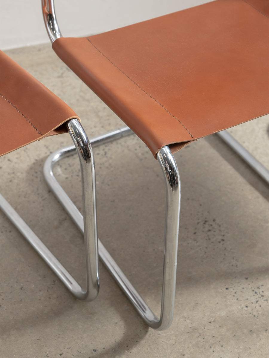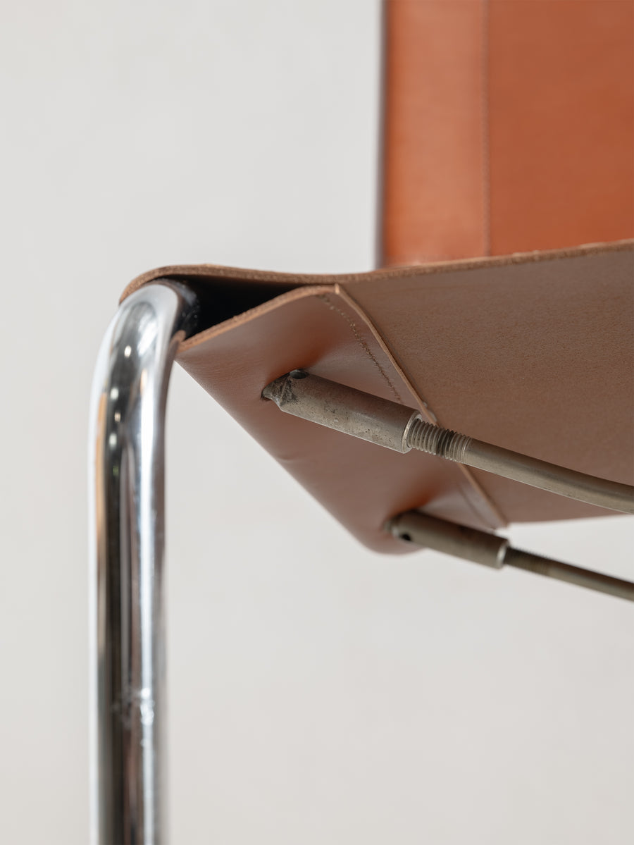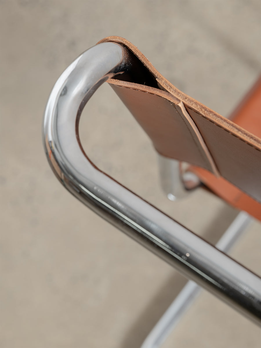 This set has been newly reupholstered in Wentworth Cedar leather, a warm tan tone that beautifully complements the polished chrome frame. The clean lines and refined proportions make it a timeless piece that works effortlessly in both contemporary and classic interiors.