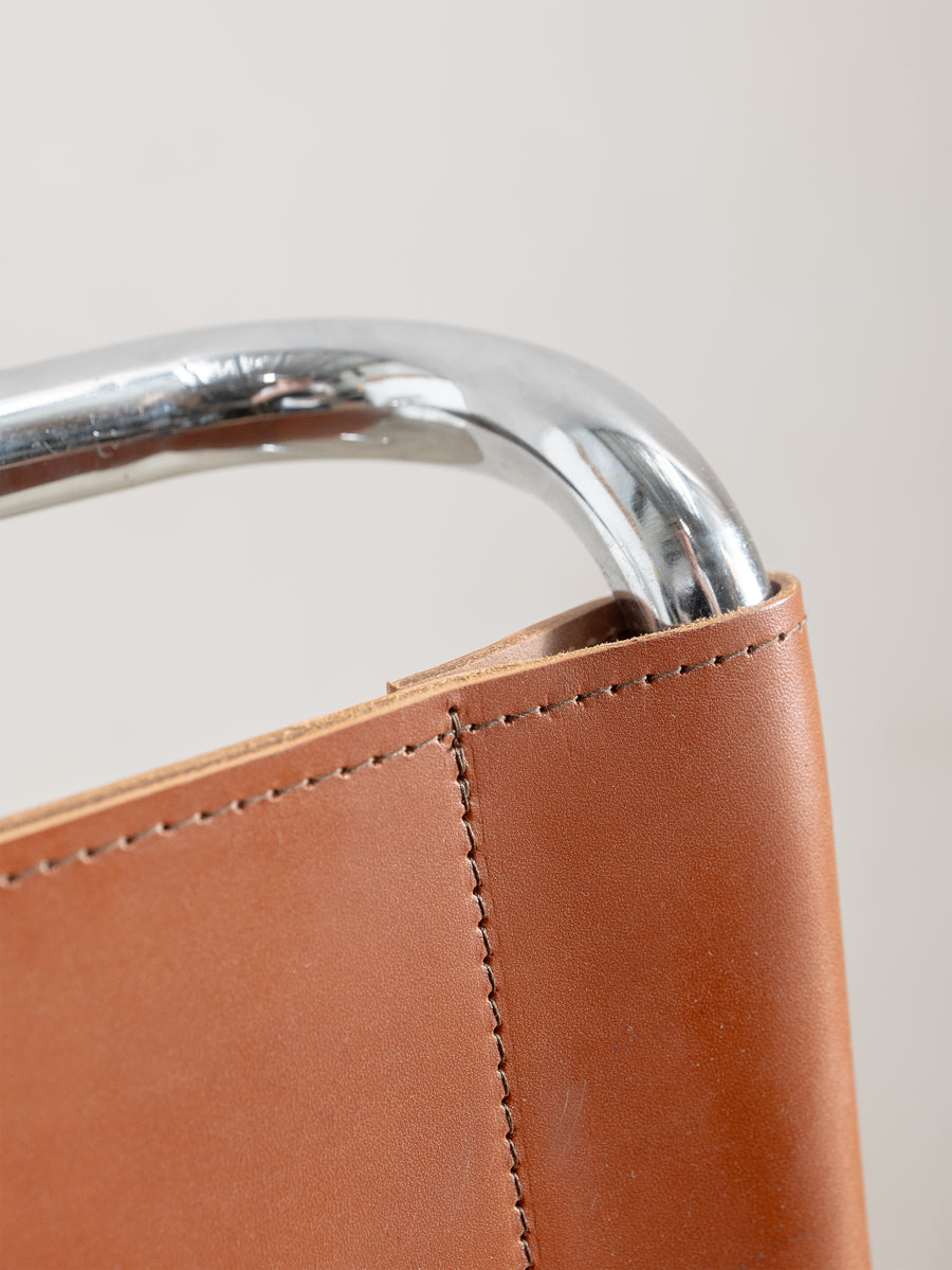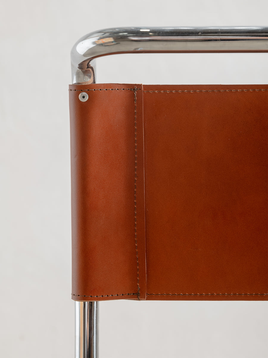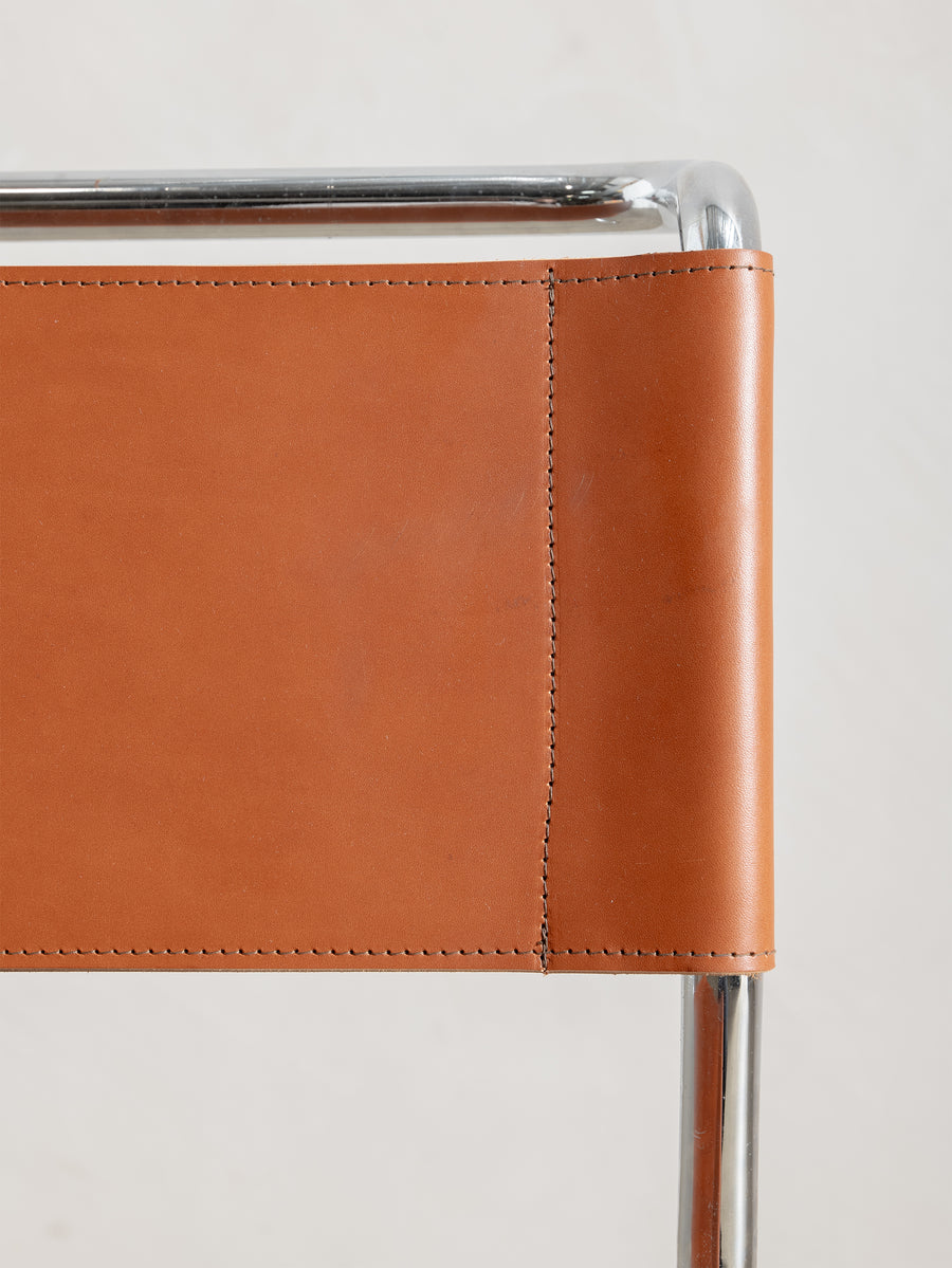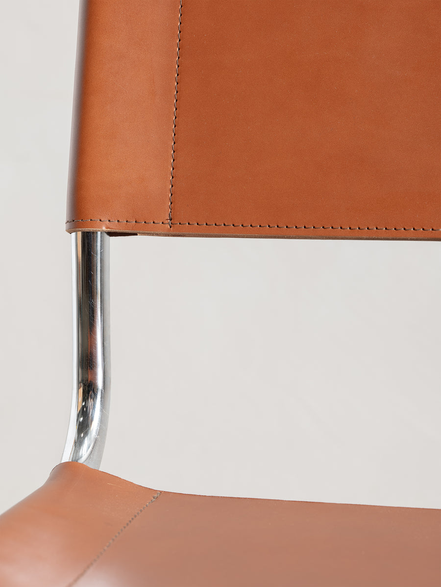 This set has been newly reupholstered in Wentworth Cedar leather, a warm tan tone that beautifully complements the polished chrome frame. The clean lines and refined proportions make it a timeless piece that works effortlessly in both contemporary and classic interiors.