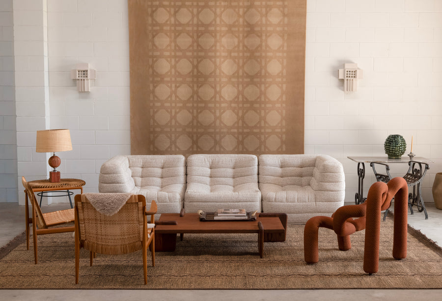 The Tangali Modular Chairs are a set comprising an armless chair, chairs with one arm (left or right) and armchairs with both arms. Individual chairs can be used in different combinations based on the seating requirement in a particular space. The contours of the modular pieces are completely shaped by hand, and the cane is wrapped and woven around the wooden frames in the signature Tangali style.