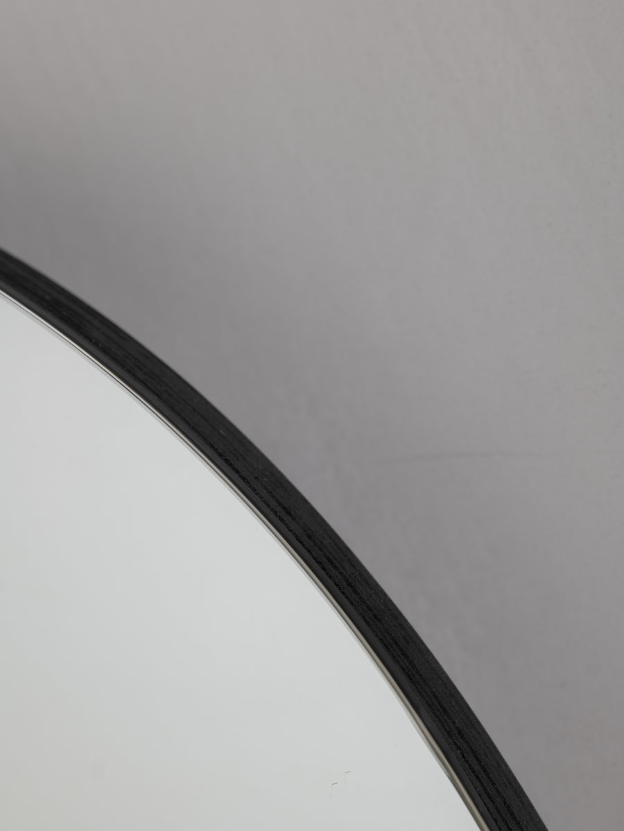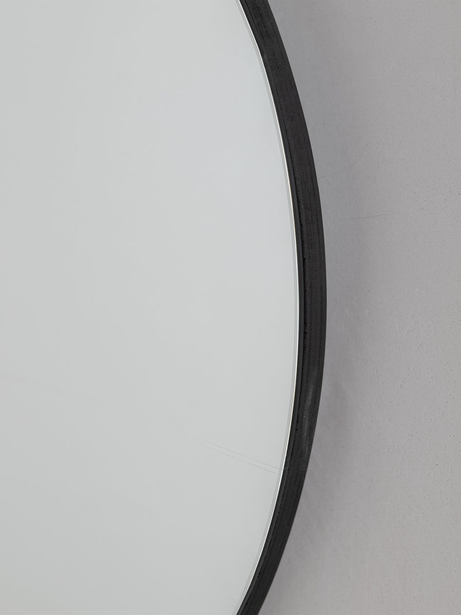 With a pronounced black timber frame, the mirror proudly protrudes from the wall as a simple, subtly sculptural piece.